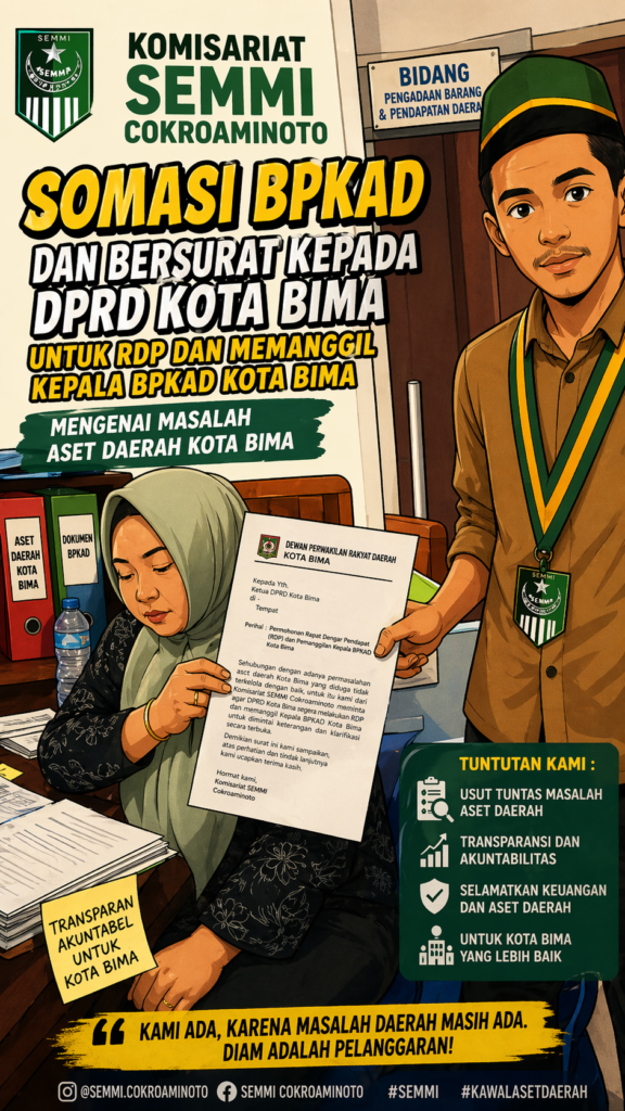 Portalmadani.com || Kota Bima —  Aroma ketidakberesan dalam pengelolaan aset daerah kembali mencuat ke permukaan. Kali ini, Ketua Umum Komisariat SEMMI Cokroaminoto Bima Iksan mengambil langkah tegas dengan melayangkan somasi resmi kepada Badan Pengelolaan Keuangan dan Aset Daerah (BPKAD) Kota Bima.