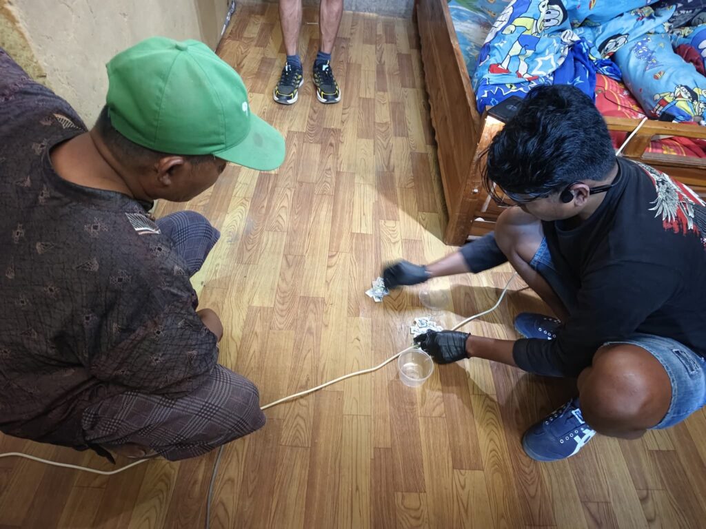 Pelaku berinisial SHR, warga desa Kore Kecamatan Sanggar ditangkap dirumahnya beserta barang bukti saat melakukan pesta narkoba.